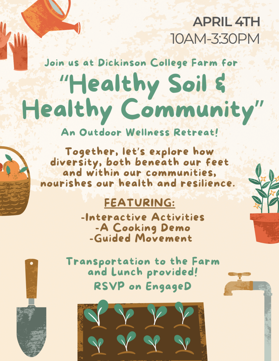 Dickinson students, faculty, and staff are invited to join the College Farm in celebrating soil and community during a half-day outdoor wellness retreat on Saturday, April 4th from 10:00am to 3:30pm! Together, we’ll explore how diversity, both beneath our feet and within our communities, nourishes our health and resilience. This unique event features hands-on activities, an interactive cooking demo, and guided movement. Through these activities, we’ll explore the question: what feeds a community?