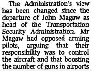 [18] Roland Watson, “Bush backs plans to give guns to pilots,” The Times Digital Archive, September 6, 2002, [WEB].