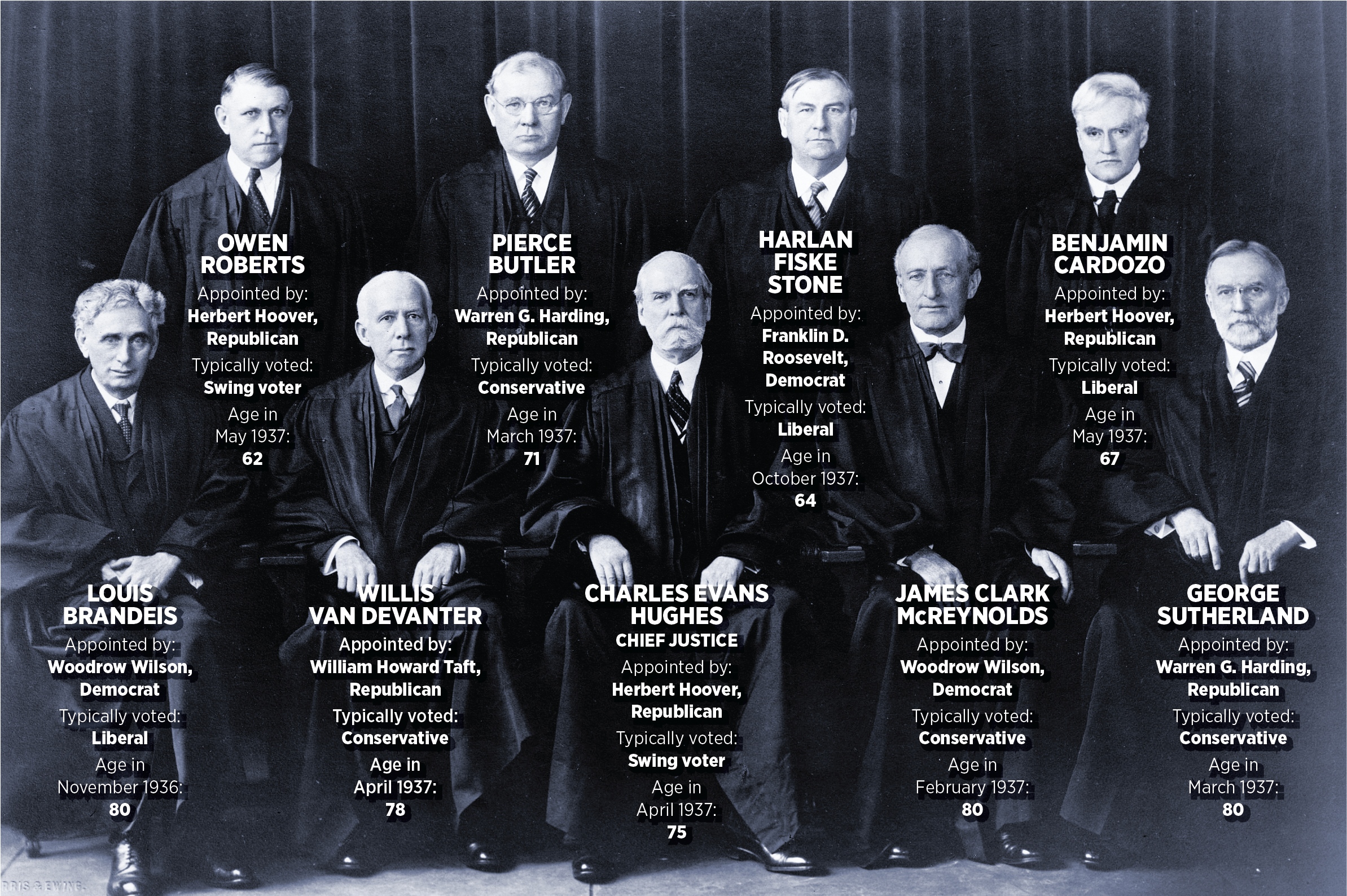 Photograph of the Hughes Court (1937), featuring Chief Justice Hughes in the center, surrounded by the associate justices (The Spokesman Review).