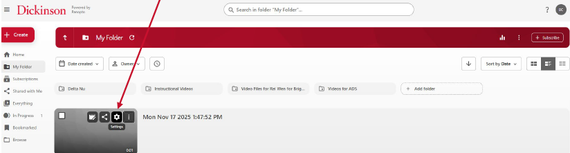- In Panopto, once the processing has finished, click the gear icon on the recording preview image