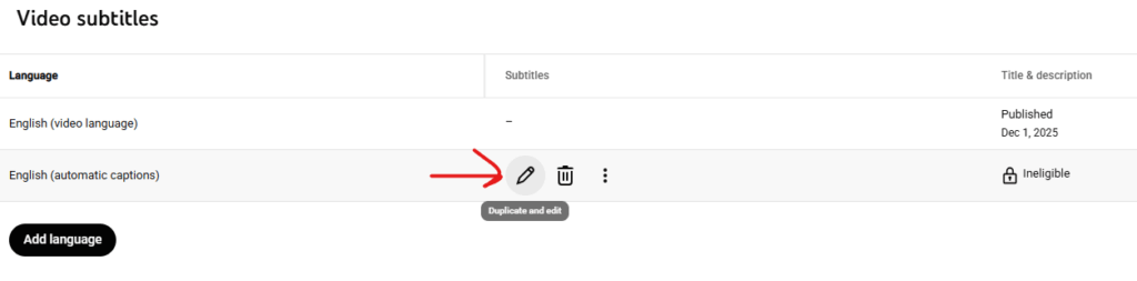 With Subtitles selected on the left, under English (Automatic), click Duplicate and Edit